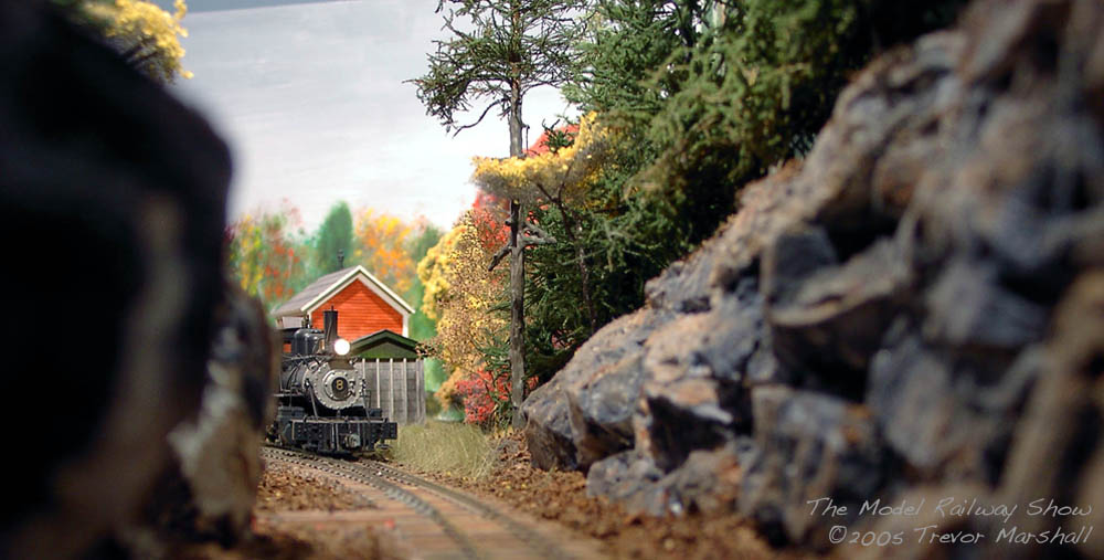 This scene in reality is a scrap of plywood with two rails pinned down – no ties. I drilled several holes, popped about 30 trees into them and poured on some piles of busted slate floor tile from my ballasting project.