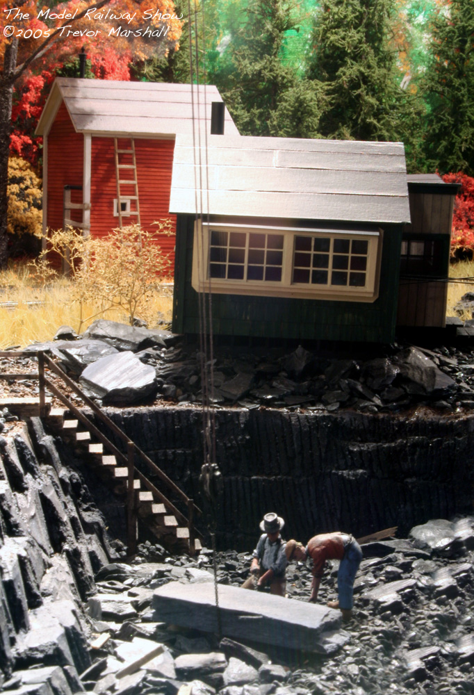 The first stage was two sections that comprised the Hebron Pond Slate Company – a slate quarry and slate works at the end of a branch line line. This had a run-around track (which also had several spots for freight cars to serve the quarry and power house), a couple of spurs into a shipping building at the slate works, a spur for a derrick in the quarry, and a modest locomotive service area that included a turntable to spin the rail bus that provided basic passenger service for quarry workers.