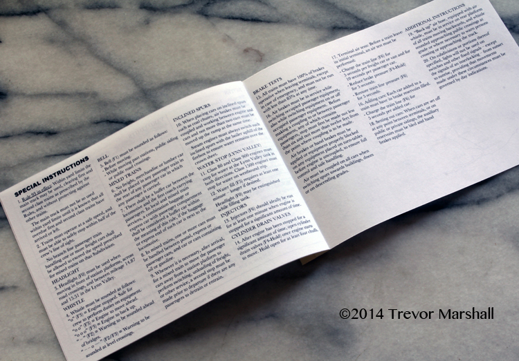Special instructions were provided on pages 4 and 5. These were a mix of prototype instructions (e.g.: a description of Rule 93 governing operation within Yard Limits) and layout instructions (e.g.: “Class 80 engines must stop for water at the Lynn Valley tank in both directions. Class 1500 engines must stop for water on the westbound trip.”)