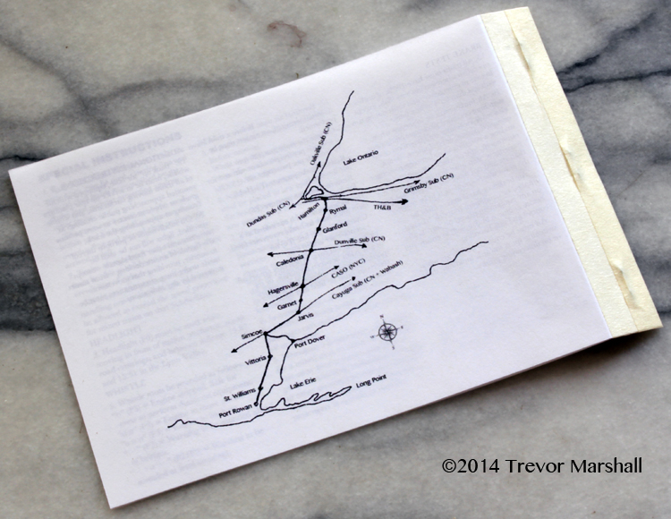 I used a scan of the prototype time table’s cover to create the cover on my version, which is shown in the lead photo for this post. For the back of my time table, I created a map showing the lines that trains would traverse on their trips between Hamilton and the two Ports – including the Simcoe Sub, the Hagersville Sub, and a short portion of the Cayuga Sub between them: