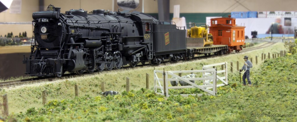 I picked up the while visiting Exporail with my friends in the S Scale Workshop last weekend. I expect it will spend most of its time on a display shelf, waiting for those times I can run it on the group’s modular layout. Here, the 4204 hauls a (very short) train over my modular contribution the Workshop’s exhibit, at the 2016 Brampton Model Railway Show: