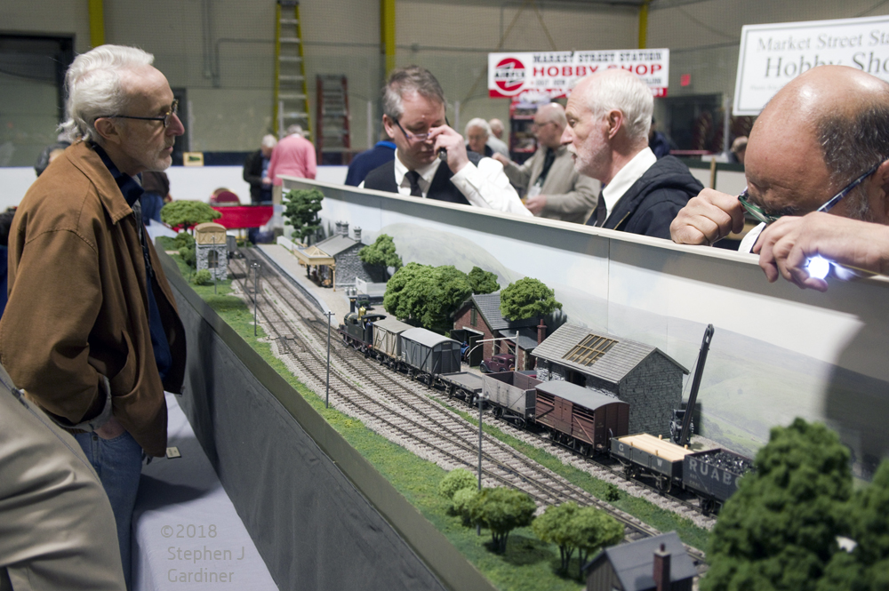 Roweham is Brian’s vision, and he’s done all of the work on the layout. For exhibitions, however, it’s nice to have several people to share the work, keep an eye on things, give everyone time to take in the rest of the show, fetch hot beverages, set up and pack up, and so on. It’s a measure of how well liked Brian is that his modest layout – roughly 16″ deep by 16 feet long – attracts a huge group of helpers – including John Mellow, Ross Oddi, Pierre Oliver, and myself. That’s more than one operator per turnout!