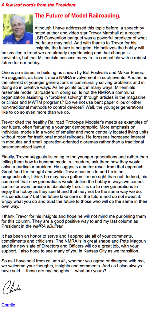 As an aside, The Austin Eagle was the final regional convention for Charlie Getz in his role as NMRA President. I was pleased that he was in the room for my address. Unfortunately, I did not get a chance to talk to him afterwards – so I didn’t get any immediate feedback. But I was pleased to read Charlie’s thoughts in the July/August 2018 NMRA eBulletin: