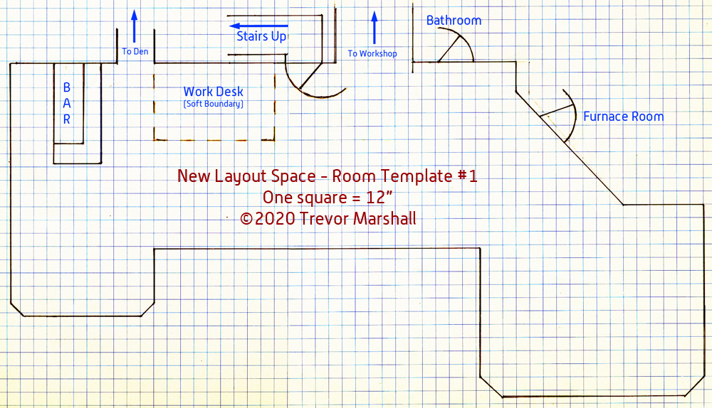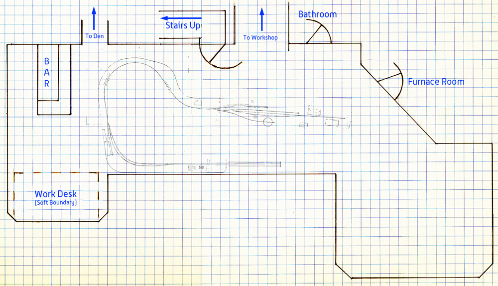 Some may question whether that’s too small to do any good. And they would be right if I was trying to develop a final layout plan, ready for me to start building. But at this point, what I was most concerned with was broad brush strokes. I was answering questions like, “Can I fit a 60″ radius turn back loop in this space, or is 48″ radius the broadest I can go?” and “Can I put a peninsula up the middle of the room?” Once I determined that, I would be able to design plans in more detail.