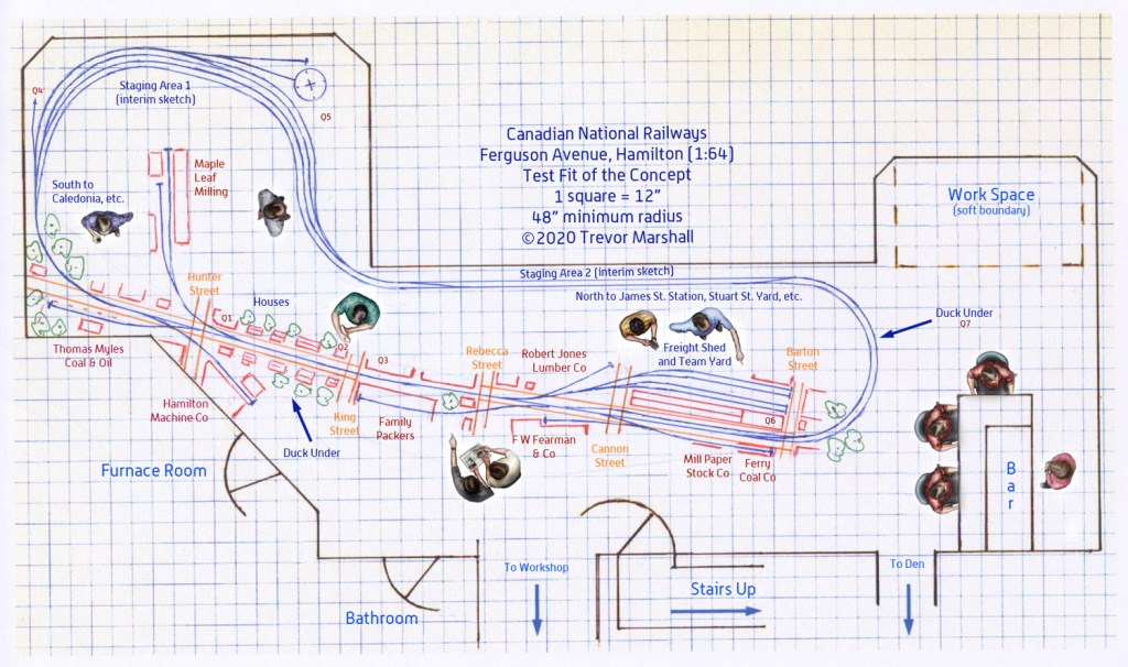 On this sketch, the freight house scene still comes out at four feet deep, but the freight shed structure occupies the centre of that depth, forcing the track closer to the aisles. Operators can reach in from both sides, and during operating sessions the crews would not have to switch sides that often: All work on the freight shed spurs would be done from inside the layout, where the two guys are standing. They can even do the transfer run from freight shed to Stuart Street Yard (staging) from there.