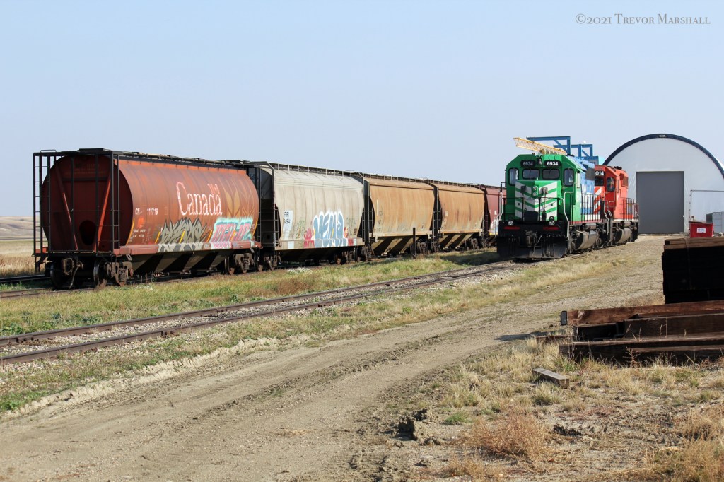 While the 70 Tonners do the switching in places like Aylesbury, MobilGrain also rosters a fleet of more modern, six-axle EMD locomotives to haul outbound grain to its interchange with the CNR.