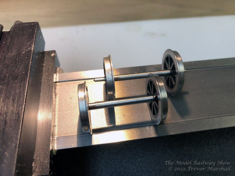 The Slaters wheels are excellent, but designed to fit into outside bearings on Slaters own kits. The Walsall kits have inside axle bearings – between the wheels, not to the outside of them. For these kits, I need to shorten the Slaters axles. Basically, I need to remove the thinner part of the axle that extends beyond the front face of the wheel so it doesn’t get hung up in the frames of the kit.