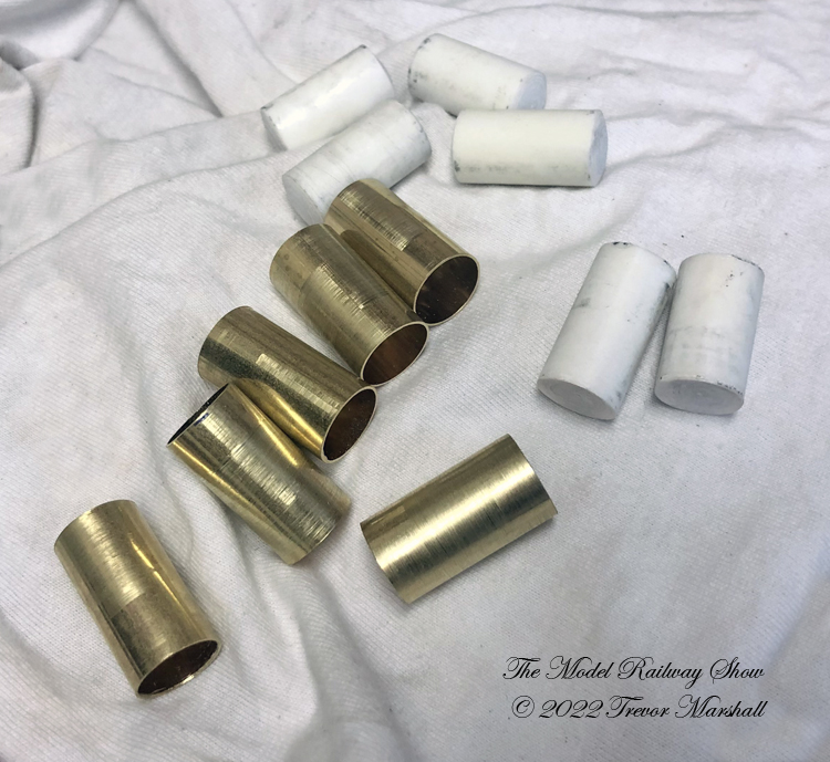 To create these, I started trimmed some brass tube to the correct length on my lathe. Then I formed tank ends from a rod built up from concentric tubes of styrene, using a radius tool on my lathe. (If I were to do this again, I would find a piece of solid rod and turn it down to the right diameter – but styrene tube was what I had on hand.) I’ll formed a tank end on each end of the styrene rods: I will cut off each end and insert it into the appropriate tube.