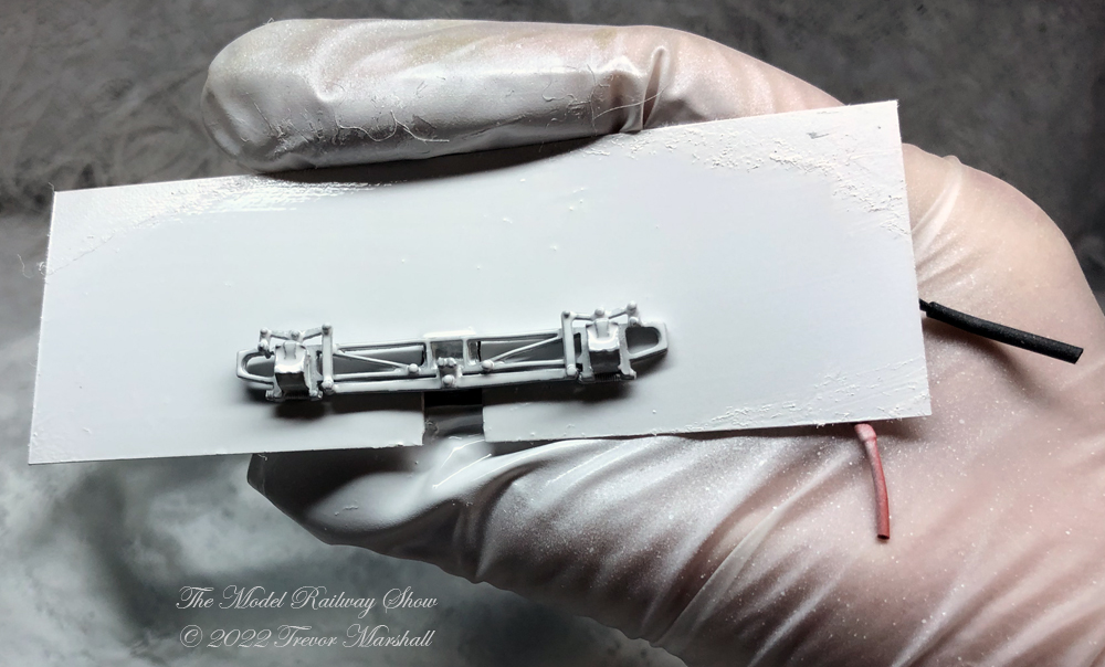 I mounted the side frames to the power trucks before painting, so to protect the trucks I taped the bottom (which has exposed gears and wire traces), then created a reusable mask from a sheet of thin styrene.