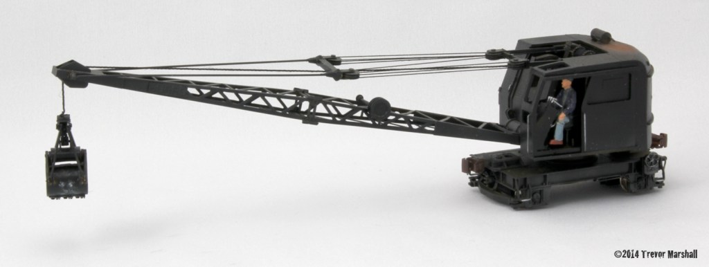 Dan Navarre at River Raisin Models imported 150 brass models of these popular MoW cranes in 1992. I found this model – unpainted – after posting a note to several newsgroups. I airbrushed the model with a warm black and weathered it with airbrush and powders. To do this, I had to unstring the rigging – making careful notes of the path of the cable so I could re-string it later. I added the operator to the cab. I also added DCC to this very small model, complete with an electronic flywheel to minimize stalling. (Later, I enhanced the model with sound – a real ship-in-a-bottle experience, which I shared in the September, 2017 issue of Railroad Model Craftsman magazine.) Unfortunately, these models do not run well: The motor is mounted vertically and makes a terrific thrashing sound. (The motor control features on modern DCC decoders definitely helped with this.) Regardless, it’s a great looking model that was a joy to photograph on the layout, so I’m really glad I have it.