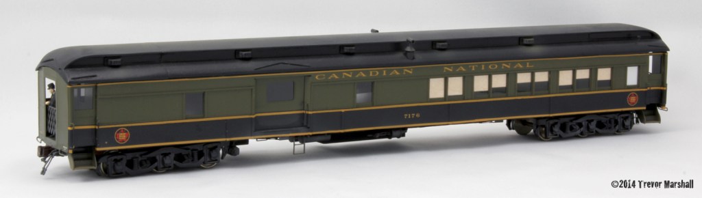 This is a mixed media kit – etched brass sides and floor, wood roof, and cast details – produced by Andy Malette at MLW Services. (Without guys like Andy, I wouldn’t be modelling the CNR in S scale.) This combine – in its green over black scheme – was essential to running the mixed train in late 1950s sessions on my railway, when CNR 4-6-0s took over duties on the branch. Pierre Oliver built the kit for me, while I did a lot of the finishing work. My contributions included adding the train air and signal lines, the conductor and gate in the vestibule, the window glass (from microscope slide covers) and shades, the opaque toilet window glass, and the weathering. Not visible, but very important to operation, are the retrofits I did to the trucks. I added rigid beam compensation using laser cut parts designed and manufactured for me by Tim Warris, brass hat at Fast Tracks. The car tracks a whole lot more reliably than it did with the American Models rigid-frame trucks, which are one of the very few options for a six-wheel truck in S scale. This combine is also fitted with a DCC-enabled back-up whistle, using an old decoder from my parts box.