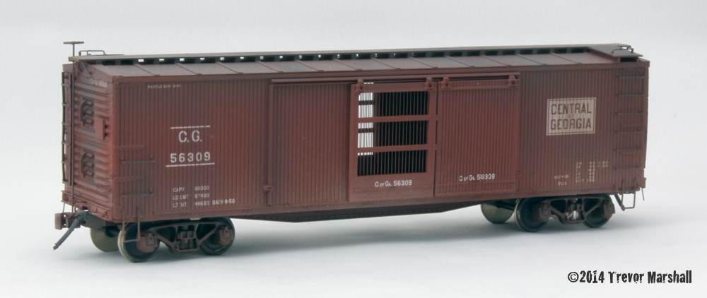 This is a Pacific Rail Shops plastic kit that was custom-decorated for the NMRA as part of its Legends Of The Hobby line. As I’ve mentioned before, Bob Hegge and his Crooked Mountain Lines were a huge inspiration for me back in the 1970s and 1980s, and when I found one of these custom-decorated kits for sale I just had to grab it. I’m really glad I did. This car features an unusual brake-rigging system, with the main rod from the B-end running outside the truck instead of between the side frames. This allows the car to more easily negotiate traction-radius curves. I modelled this following photos and data from an HO scale Westerfield kit for a Pacific Electric boxcar. Other upgrades include a wood running board and plastic brake rods replaced with wire. I get a kick out of running this car every time…