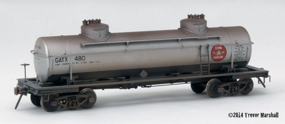This is a WA Drake and Company brass import of an 8,000 gallon Type 103 double-dome tank car. It came factory-painted. I like the double domes. And I’m really pleased with the weathering job I did on it. As with all of my freight cars, I added flexible train line air hoses from BTS to this car: They look better than the cast hoses that come on most brass cars and because they’re flexible, they don’t break off.