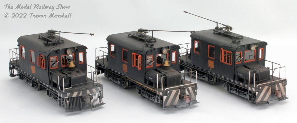 William also supplied a number of white metal castings – including his 8′ wheelbase Alco-Allen truck side frames – and the trolley pole. I added scratch-built air tanks plus details from a number of suppliers – including BTSRR, Precision Scale Co., and Q Car Company. I like how these three units express a family appearance while exhibiting unique details.