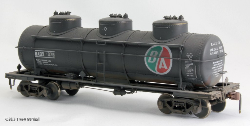 This is a brass model (as evidenced by the bare brass peeking out around two of the domes), which I painted for a Canadian petroleum company. The lettering – the most important part of this project – came from Al Ferguson at Black Cat Publishing: He offers this set in HO scale, and kindly did a custom run for me in S. This is a great resource for Canadian modellers. Reasonably, he charges twice the price of the HO decals, since it’s a custom run. Also reasonably, this is a lot less than the set-up fee one would expect. Thanks, Al!
