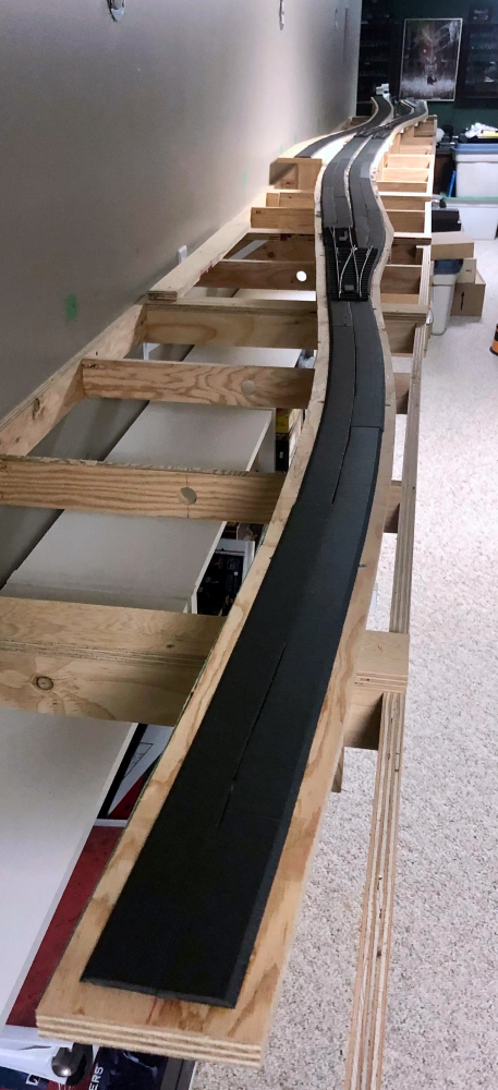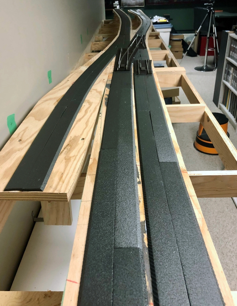 I haven’t yet built the two-track staging shelf: That will come later. But I do have enough leftover roadbed to finish it when the time comes.