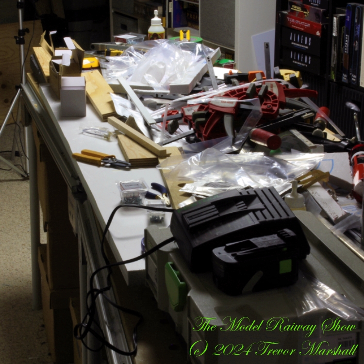 I’ve been making great progress on my 7mm layout inspired by the Great Western Railway in the Edwardian Era. If there were any doubts, this view of my portable workbench should dispel them: