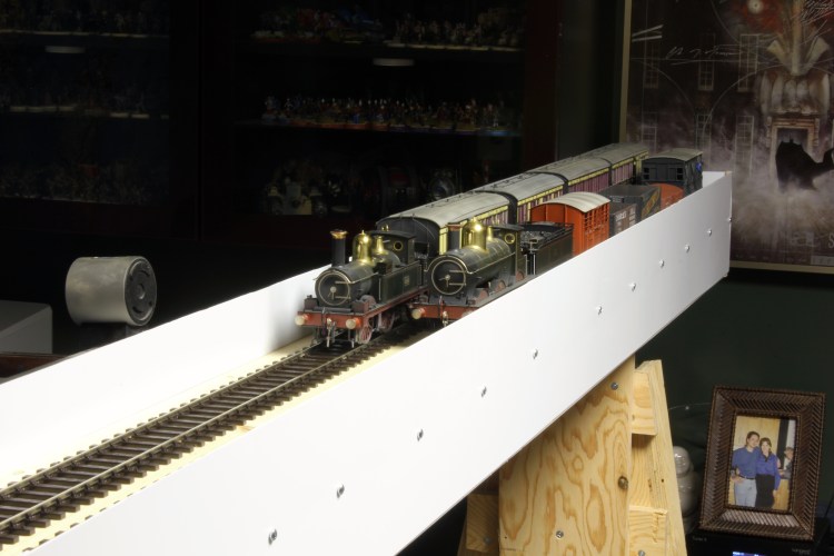 I started by cutting a seven-inch wide strip out of an eight-foot-long shelf. This provided enough width for two tracks, and enough length for good-sized trains (In fact, longer than I’m likely to run.)
