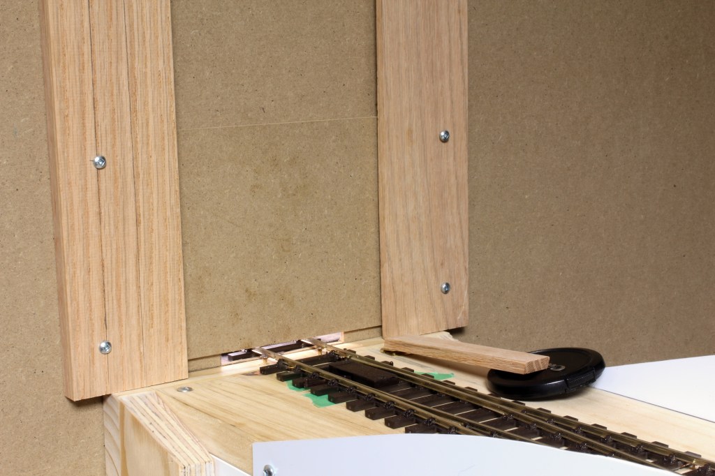 Where the staging shelf meets the layout, I built a pocket to accept the shelf – which is secured to the layout via two more furniture bolts. I cut a tunnel in the end of the layout and then designed a portcullis to close off the hole when the staging area is not in place.