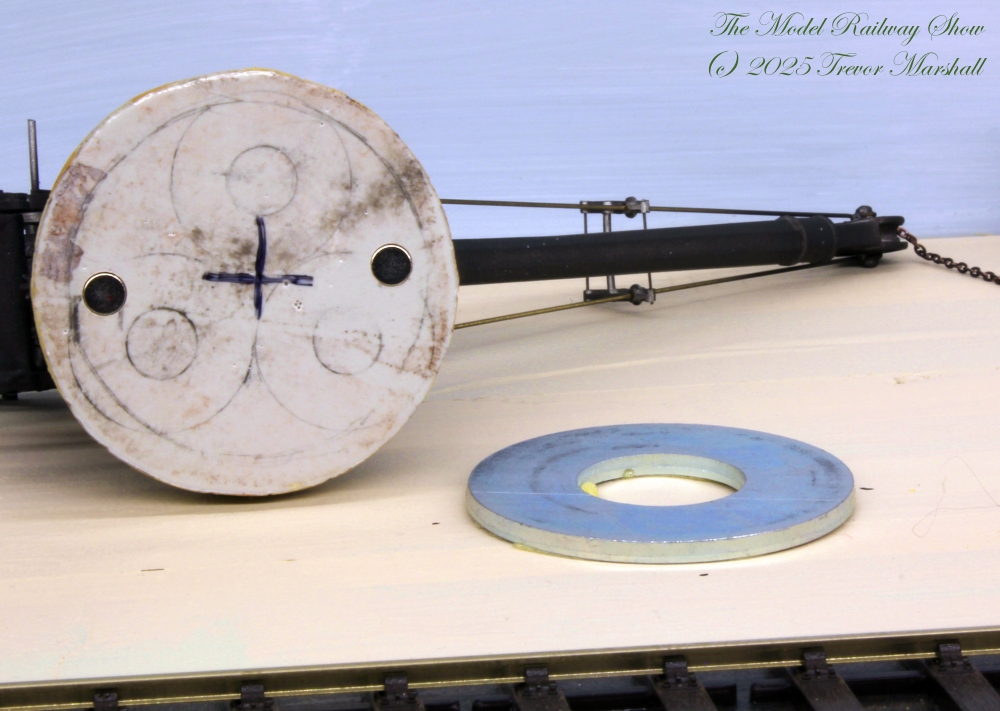 When it’s time to do scenery, I’ll build a ring around the washer, with a diameter just larger than the plinth, then build up the ground contours to bury it. The plinth will also rotate with the crane, but I’m fine with that.