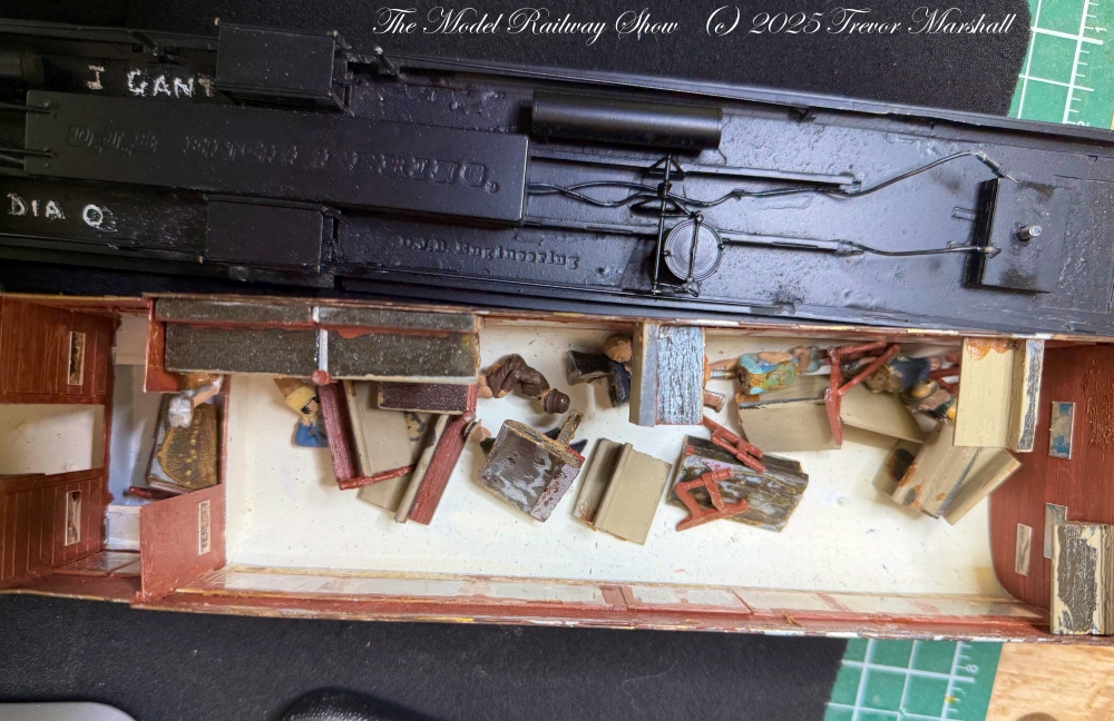 The bigger mess was found in the passenger compartment, where a number of white metal figures and seats became unglued. Fortunately they did not damage any of the windows. I re-glued the seats but didn’t bother adding the additional passengers: I’ll only use the railmotor on lightly patronized schedules on my branch.