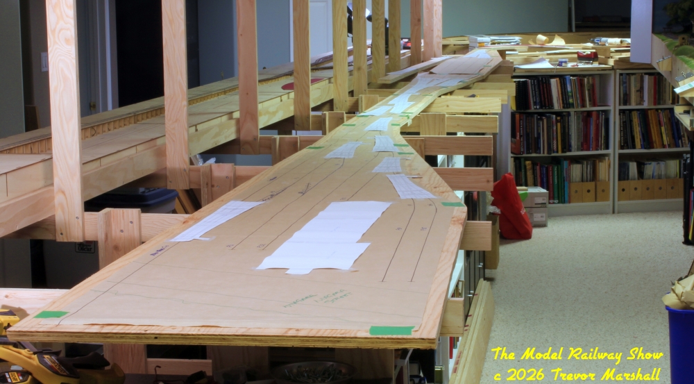 Having recently built the basic framing for the final phase of my S scale Niagara St. Catharines & Toronto Railway layout, I am keen to get started on track. To that end, I added a stop at the lumber yard to yesterday’s errands and came home with a 4×8 sheet of 3/4-inch plywood. I laid sections on the benchwork, rolled out a length of kraft paper, and started flinging ideas about.