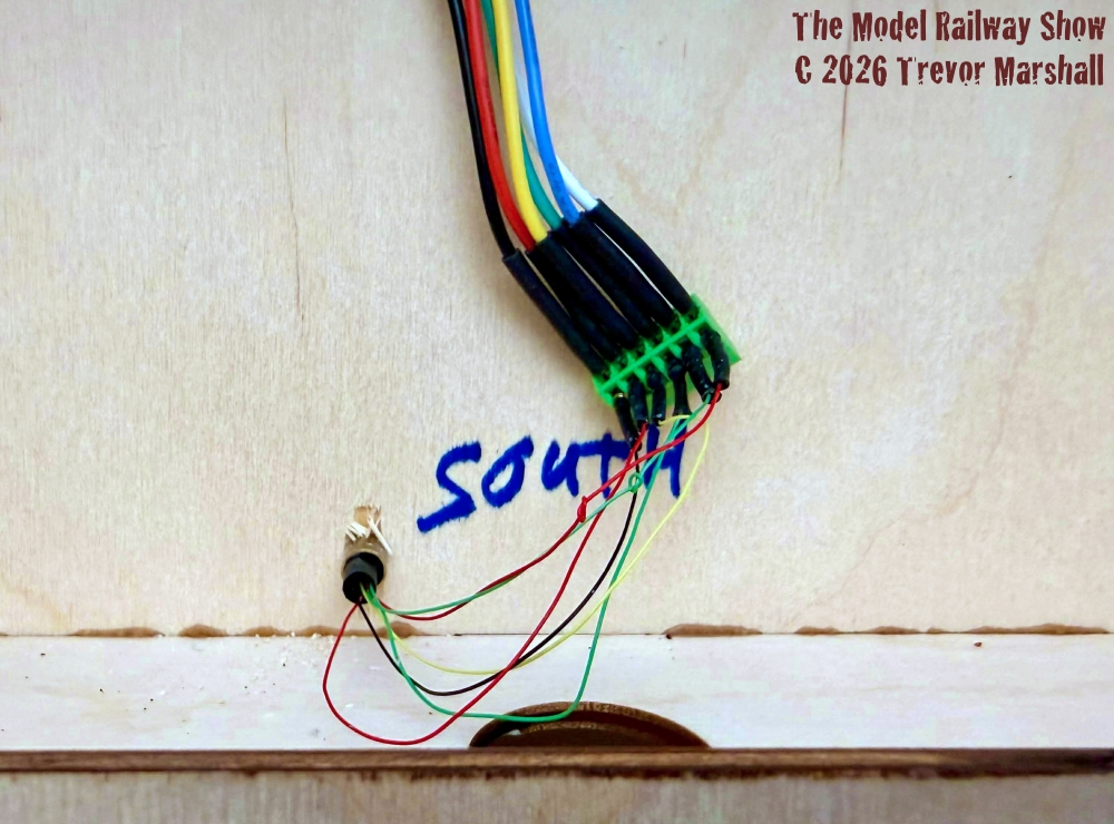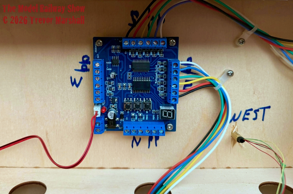 The controller is mounted on the underside of the benchwork, near the street light controlling westbound traffic. I marked the baseboard with the compass points that correspond to the controller’s outputs to I could be sure to hook the correct light to each side.