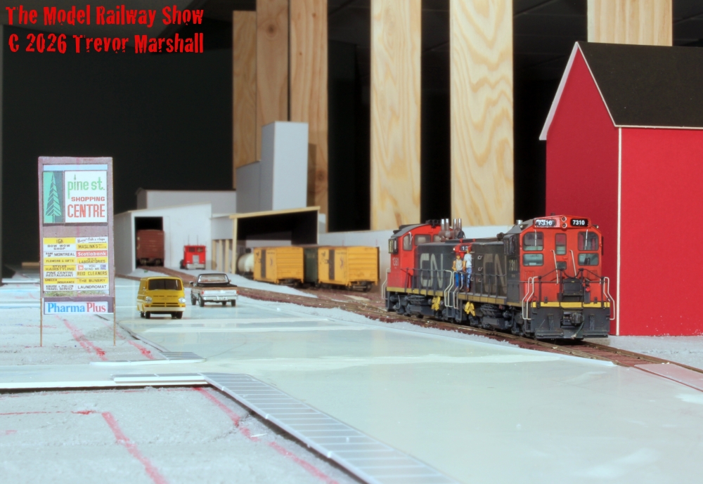 There were just a few spurs and no run-around (because they’re real space eaters on a layout). The spurs were all parallel to save space, but at three different elevations (to add visual variety). Two of the spurs hosted different freight car types with spot-specific sorting (to add to the operating fun). And everything was lined up along the street, making it easy to view and photograph from public property (and easy to fit on a shelf). There’s even a shopping centre across the road, with a nice big sign that tells the viewer exactly where they are.